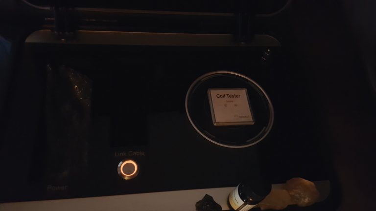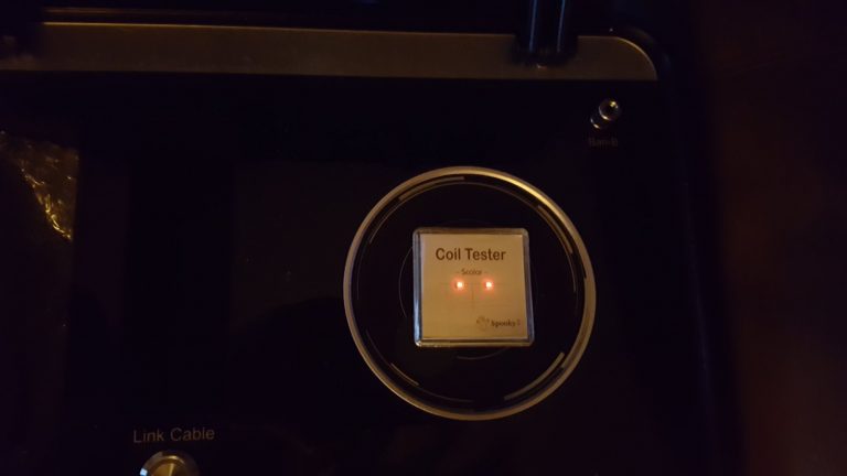 In any event, here are two pictures of both the coil tester being energized by the receiver coil without the link cable connected. The picture above shows the coil tester lights up. In the picture below, the LED on the receiver box is turned on, which robs the power to light up — hence the coil tester goes dark. Both of them prove that Spooky2 Scalar can work in wireless mode.